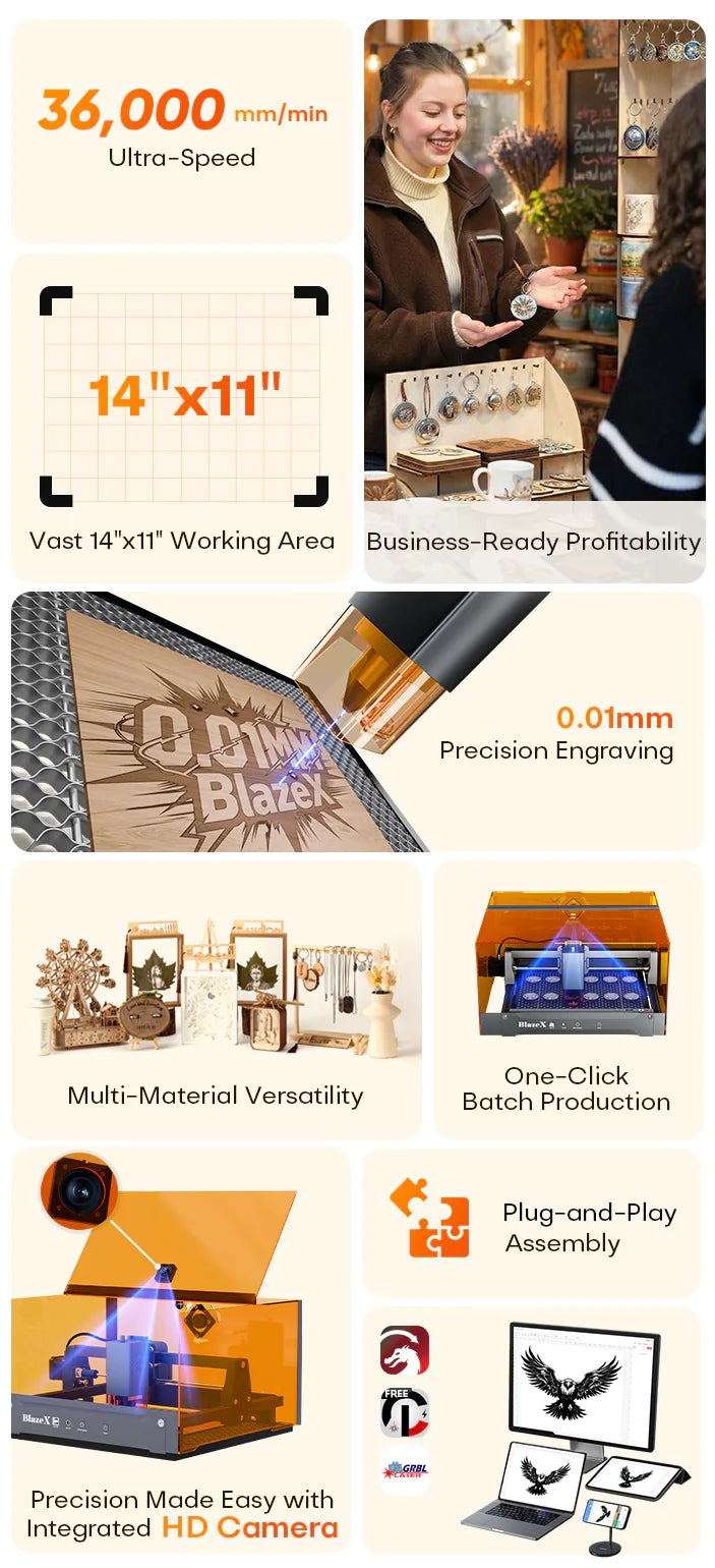 · Beginner-Friendly Precision: Designed for effortless assembly, it offers engraving accuracy down to 0.01 mm and speeds up to 36,000 mm/min — perfect for those new to laser engraving.
