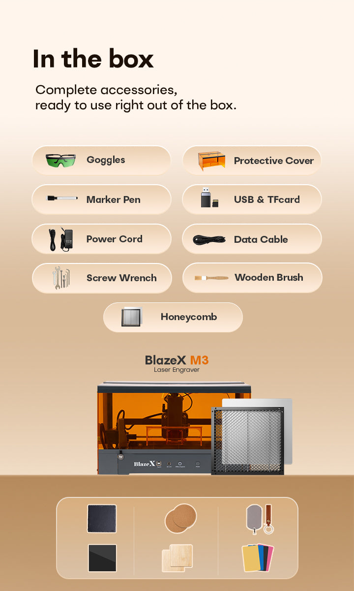 “I’m very impressed with the BlazeX M3 Pro. Setup was quick and straightforward, even for a beginner. The 10W laser is powerful enough to engrave and cut cardboard, wood, and plastic cleanly. Great value for a compact machine.”