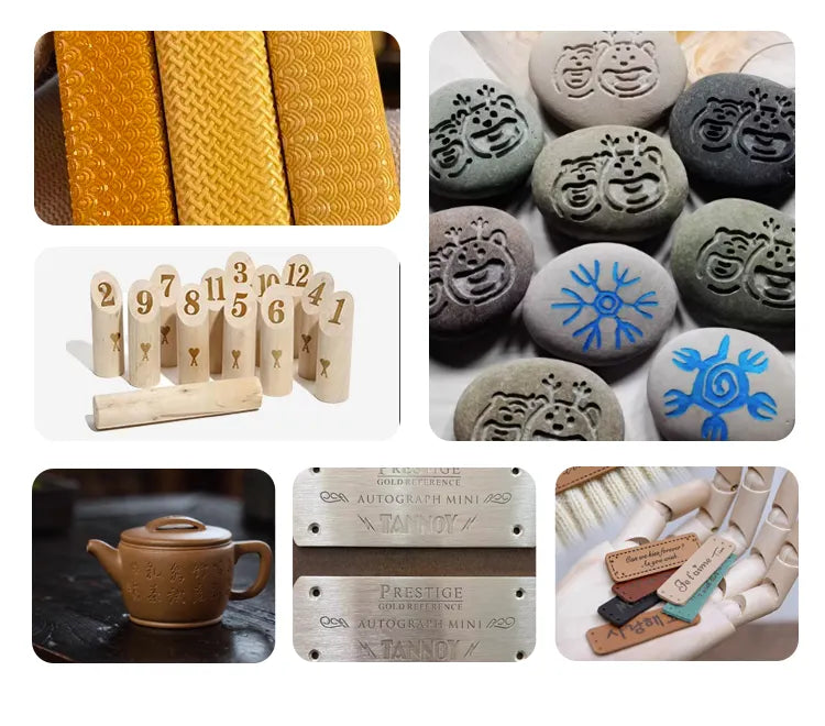 • Wide Material Compatibility: Works on wood, bamboo, leather, acrylic, paper, plastic, fabric, glass, ceramics, and more.