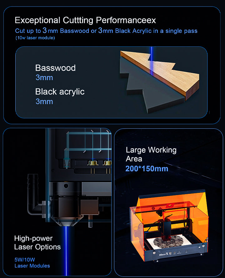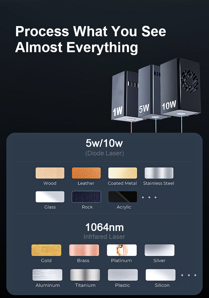 - Exceptional Versatility: Easily switch between interchangeable laser modules — 10W, 5W, and 1W IR — to handle a broad range of engraving and cutting materials with precision.